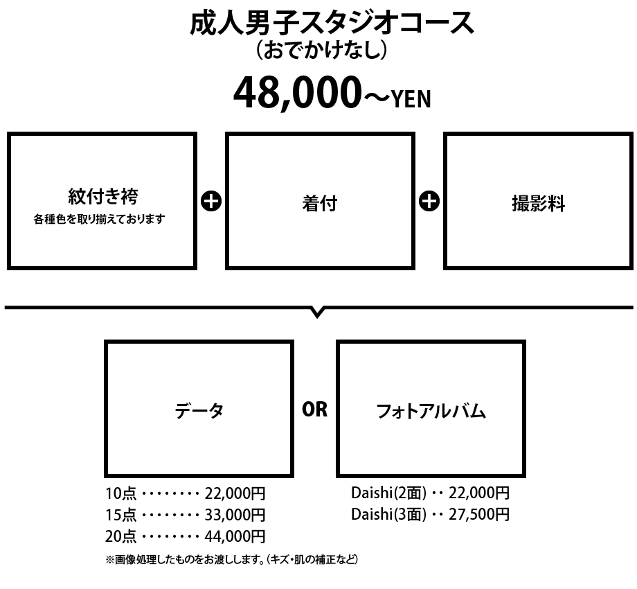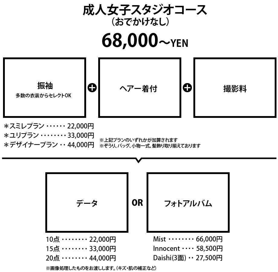 CONCEPT PRICE GALLERY RESERVATION 20TH FURISODE成人式振袖Tweet 大人になる節目の記念にお気に入りの振袖で思い出に残しませんか? 地域で一番の品揃えです。 お客様からもお気に入りの1着に出会えたと喜ばれています。 前撮りと当日であなたらしいコーディネートを写真に残します。 展示会も開催しておりますので、ホームページをご確認してください。 撮影の3つのポイント スタジオ・お客様のご希望に合わせたロケーション撮影 前撮り撮影は、衣装一式・着付けがセットでお得 表情だけでなくイメージに合わせたストーリー性のある撮影 PRICE 成人式「撮影のみコース」ご案内 こちらはおでかけなしの成人式撮影コースです。 成人式当日や前撮りでの予約がかぶらないので すべての振袖や紋付袴からよくばってお選びいただけます。 撮影のご予約も前撮り(式前)・後撮り(式後)とご自由にお決めください。 前撮りは気候を考慮した春と秋、 後撮りは2月と3月が落ち着いて撮影できます。 ご本人でご用意するもの ※女子:白タオル5枚 ※男子:白タオル3枚とVネックの肌着 レンタル着付小物 和装スリップ:(M) ¥1,100 / (L) ¥1,650 足袋 (22.0~24.0cm):(男/女) ¥1,100 足袋 (24.5~29.0cm):(男/女) ¥1,650 GALLERY ※クリックすると拡大できます。 RESERVATION